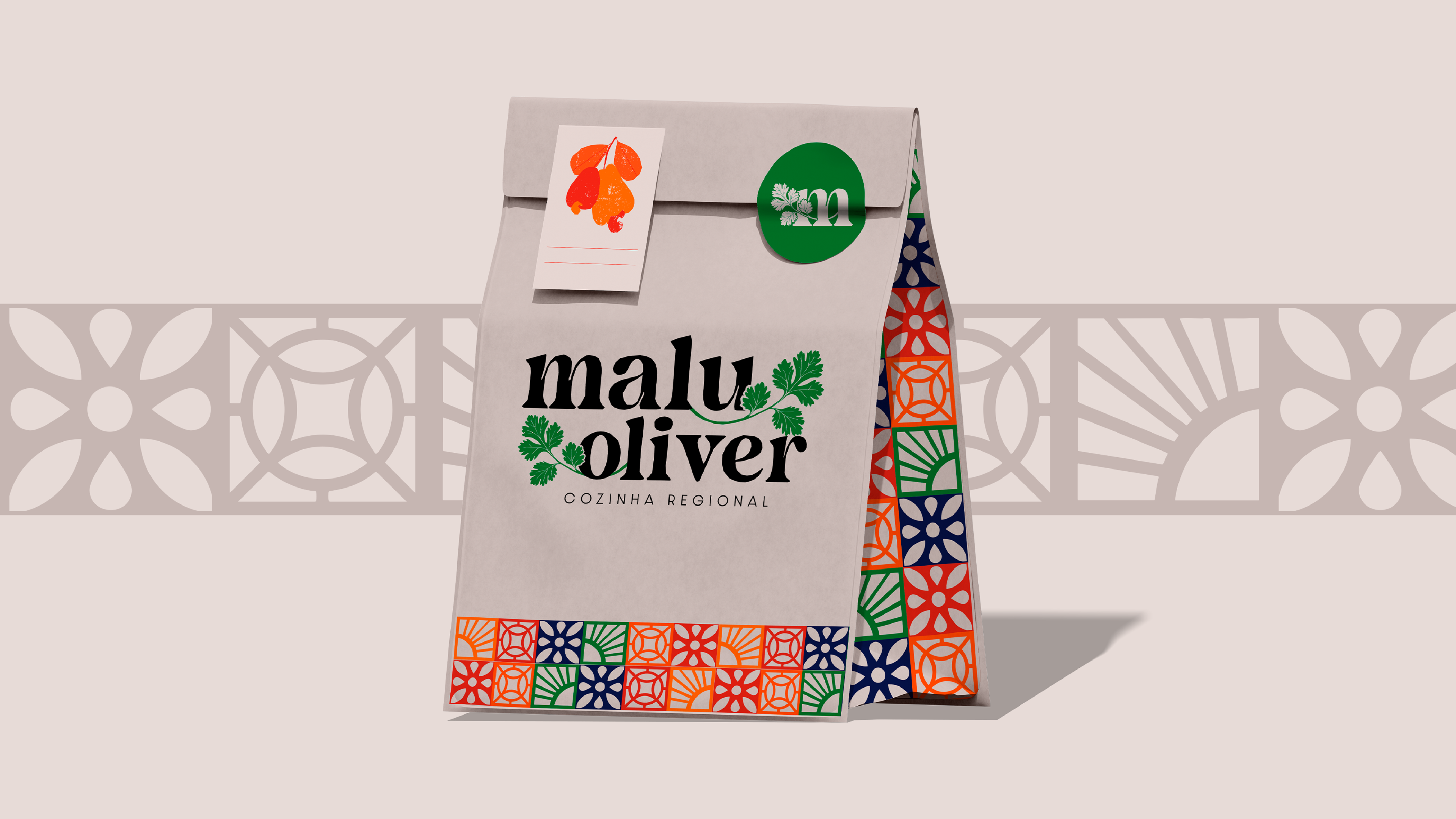 As tipografias marcantes e o uso do verde do coentro, símbolo da culinária regional, reforçam o caráter afetivo e sensorial da marca, enquanto o padrão colorido inspirado nos cobogós típicos transmite o espírito vibrante da cultura local.